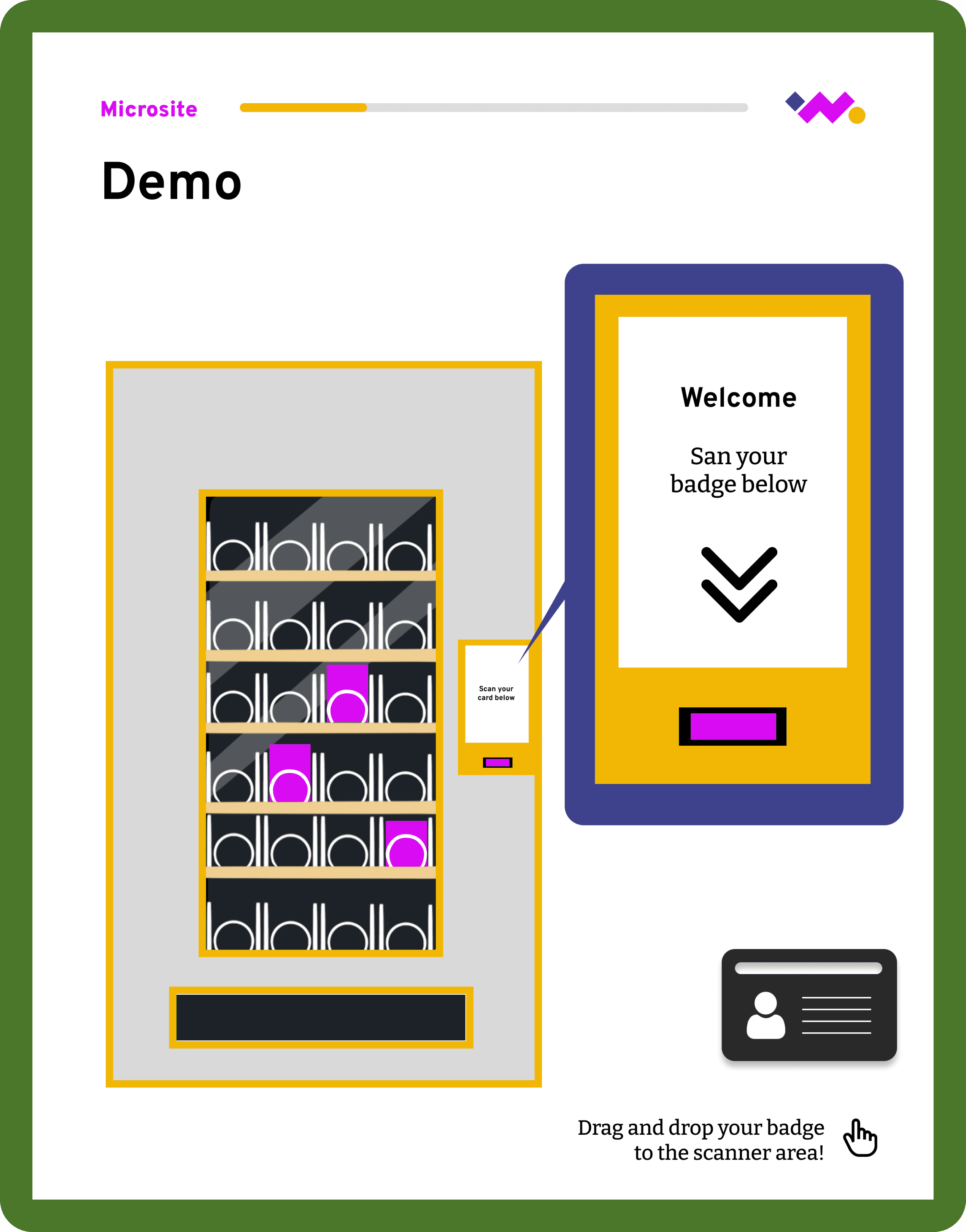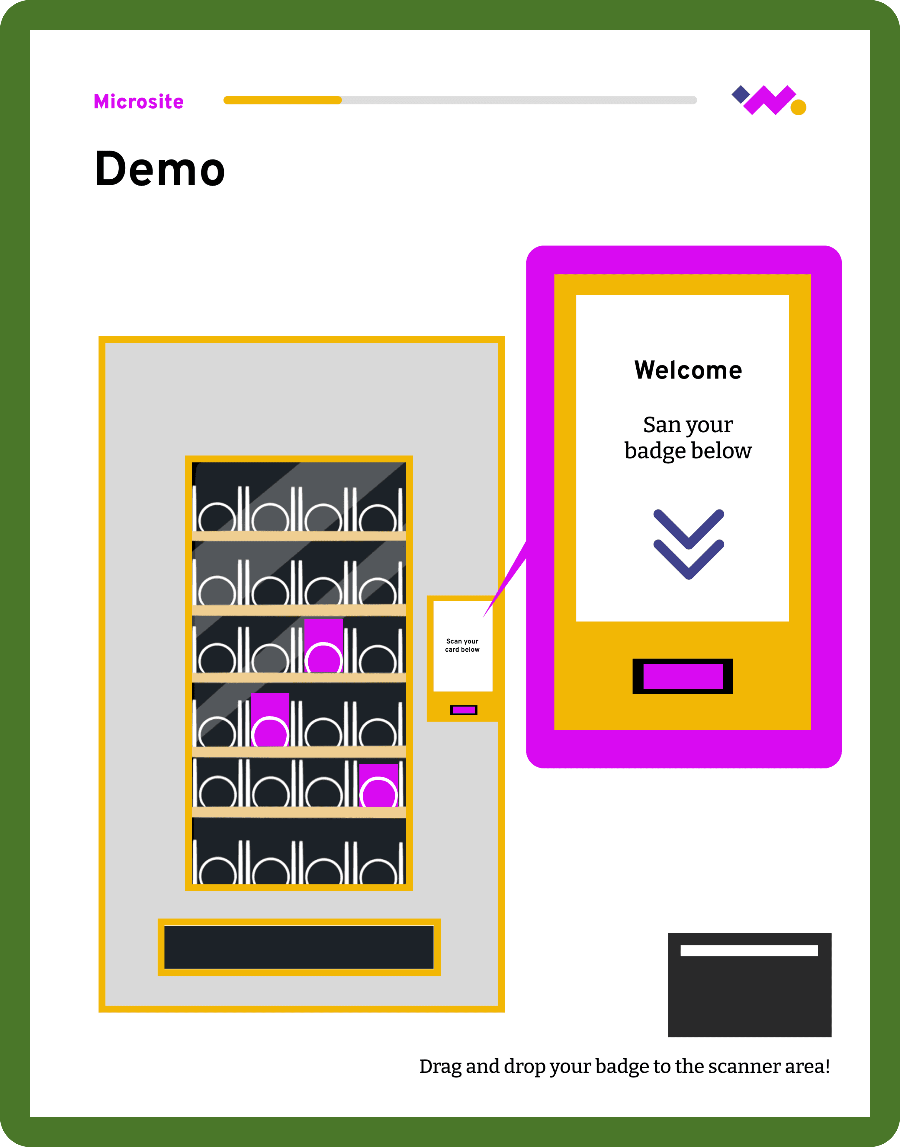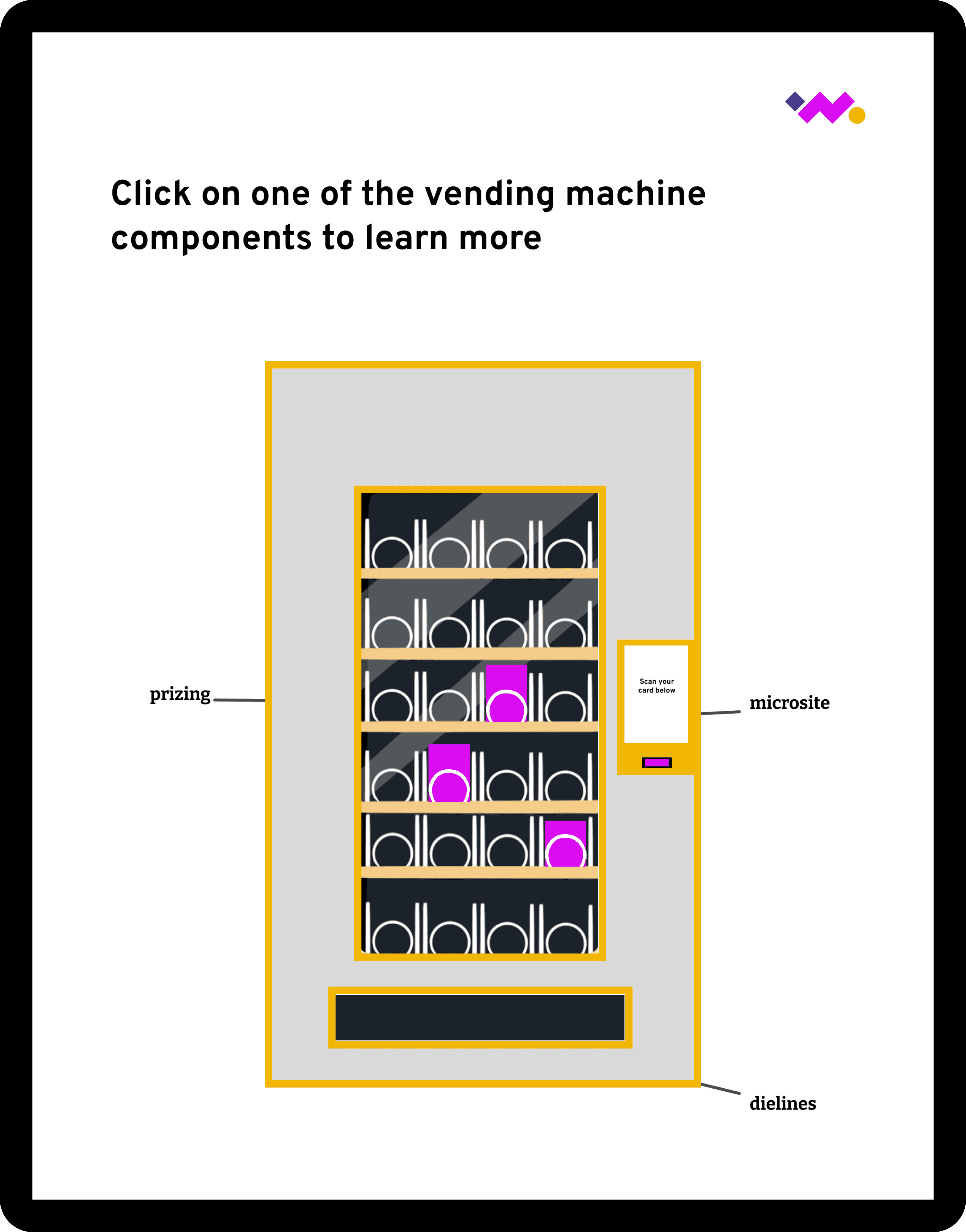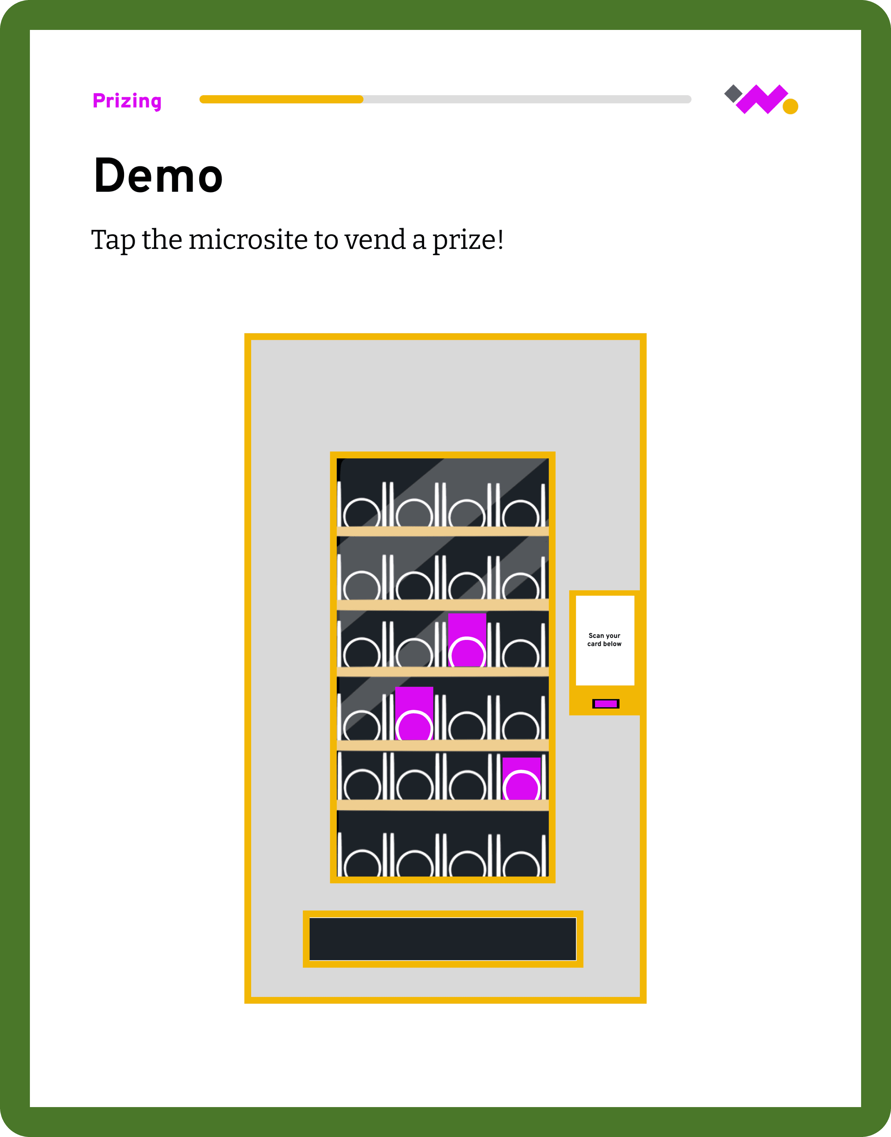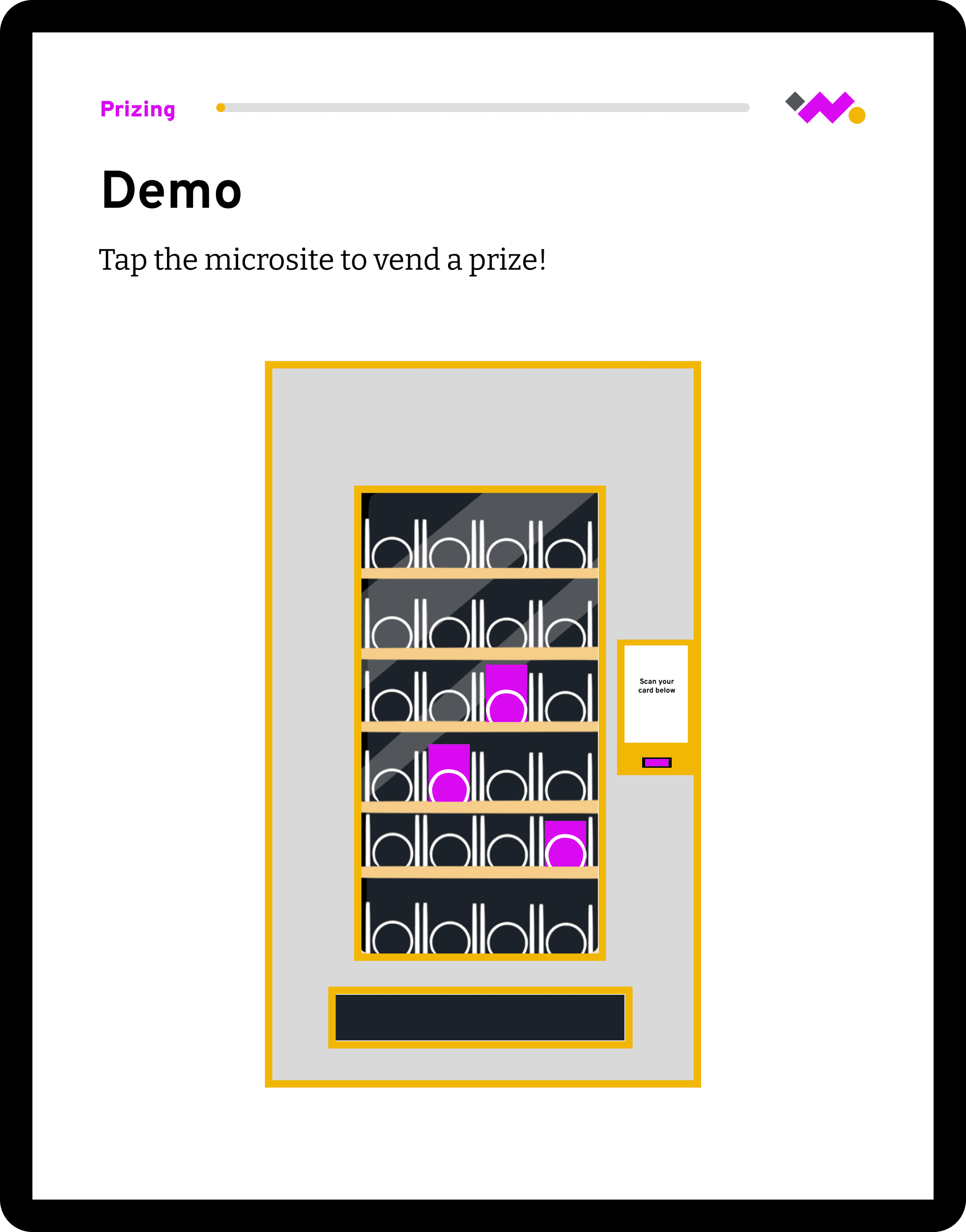 To improve context and flow, we redesigned demo pages to build off the home page vending machine visual. This explicitly points to the sections referenced on the homepage and helped users understand where they were in the experience.