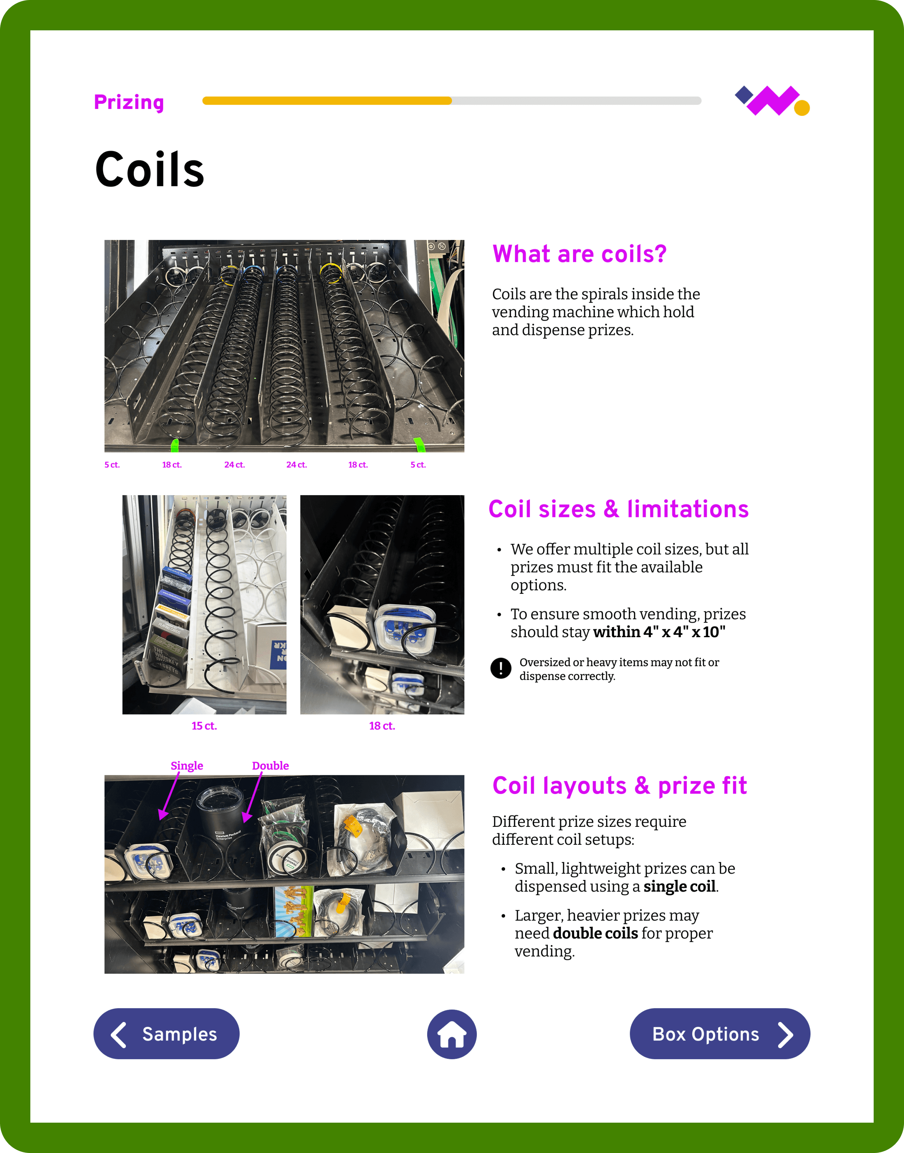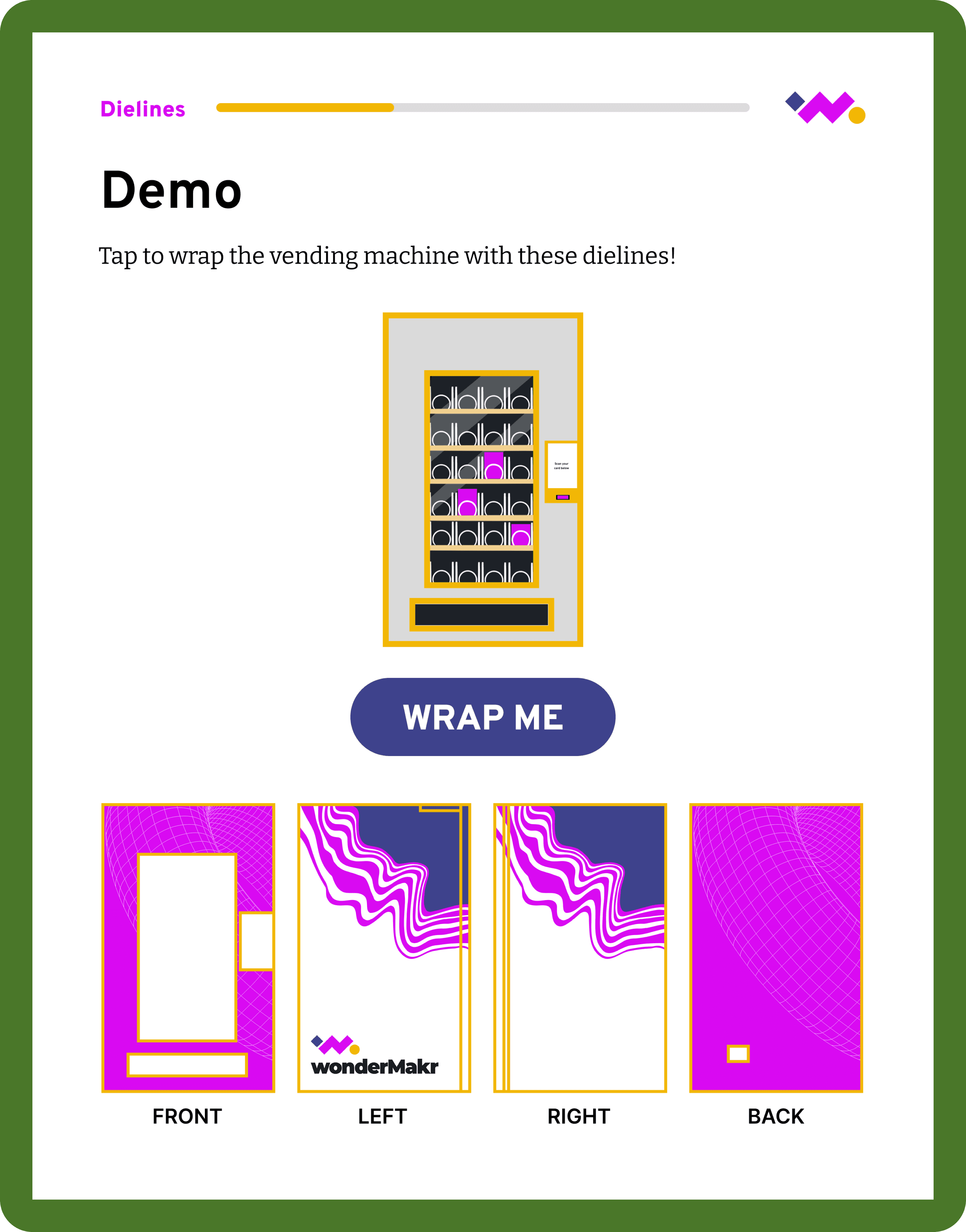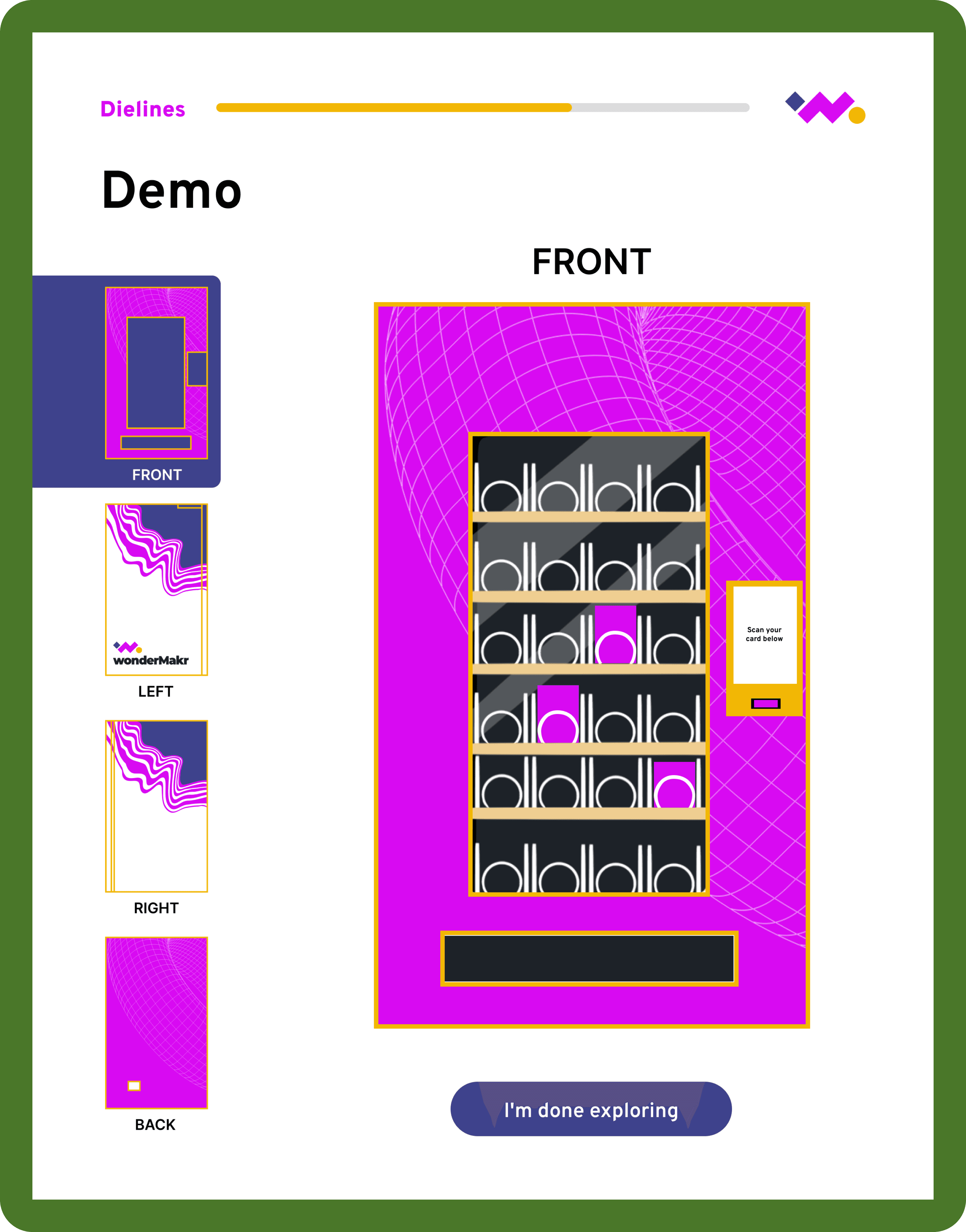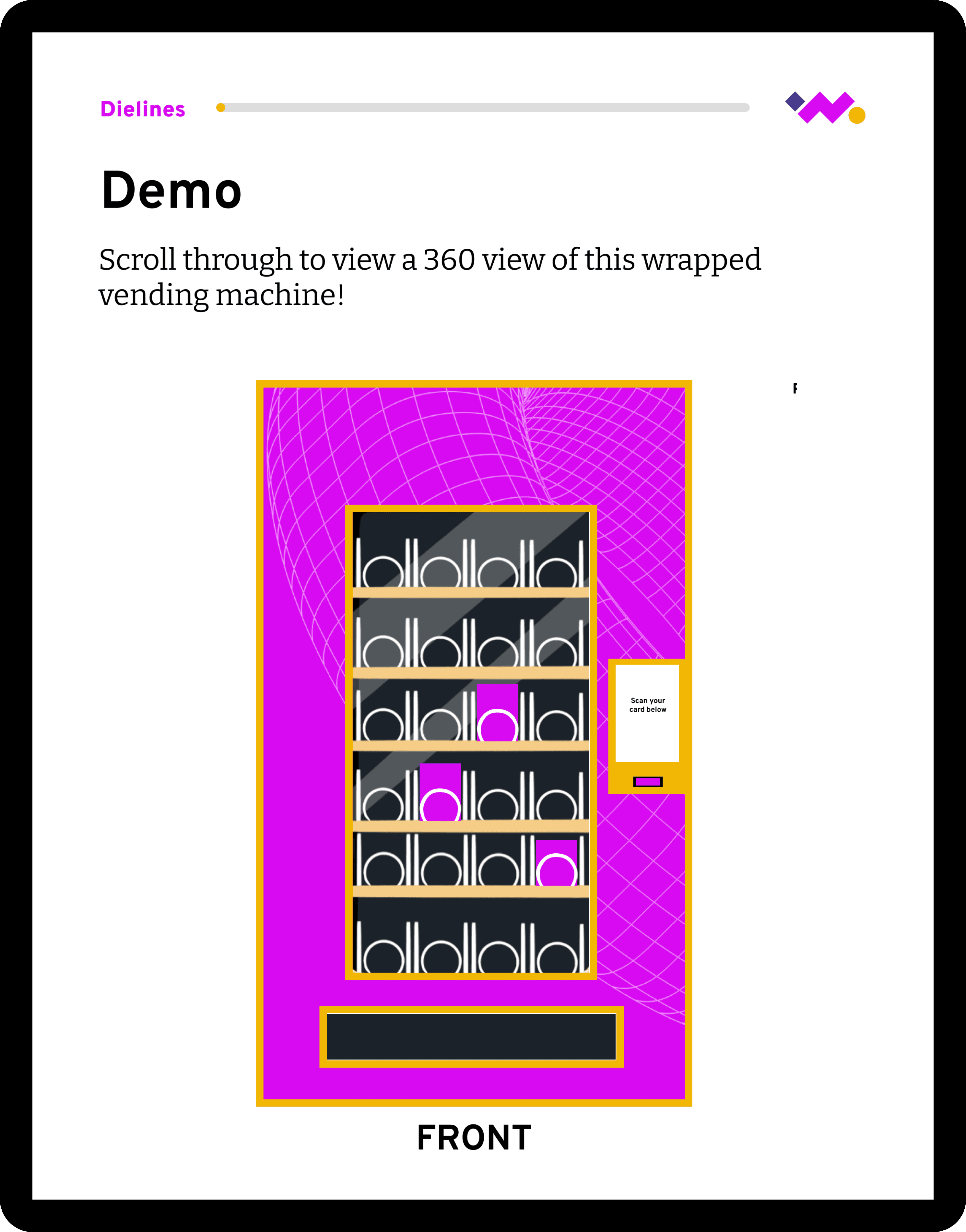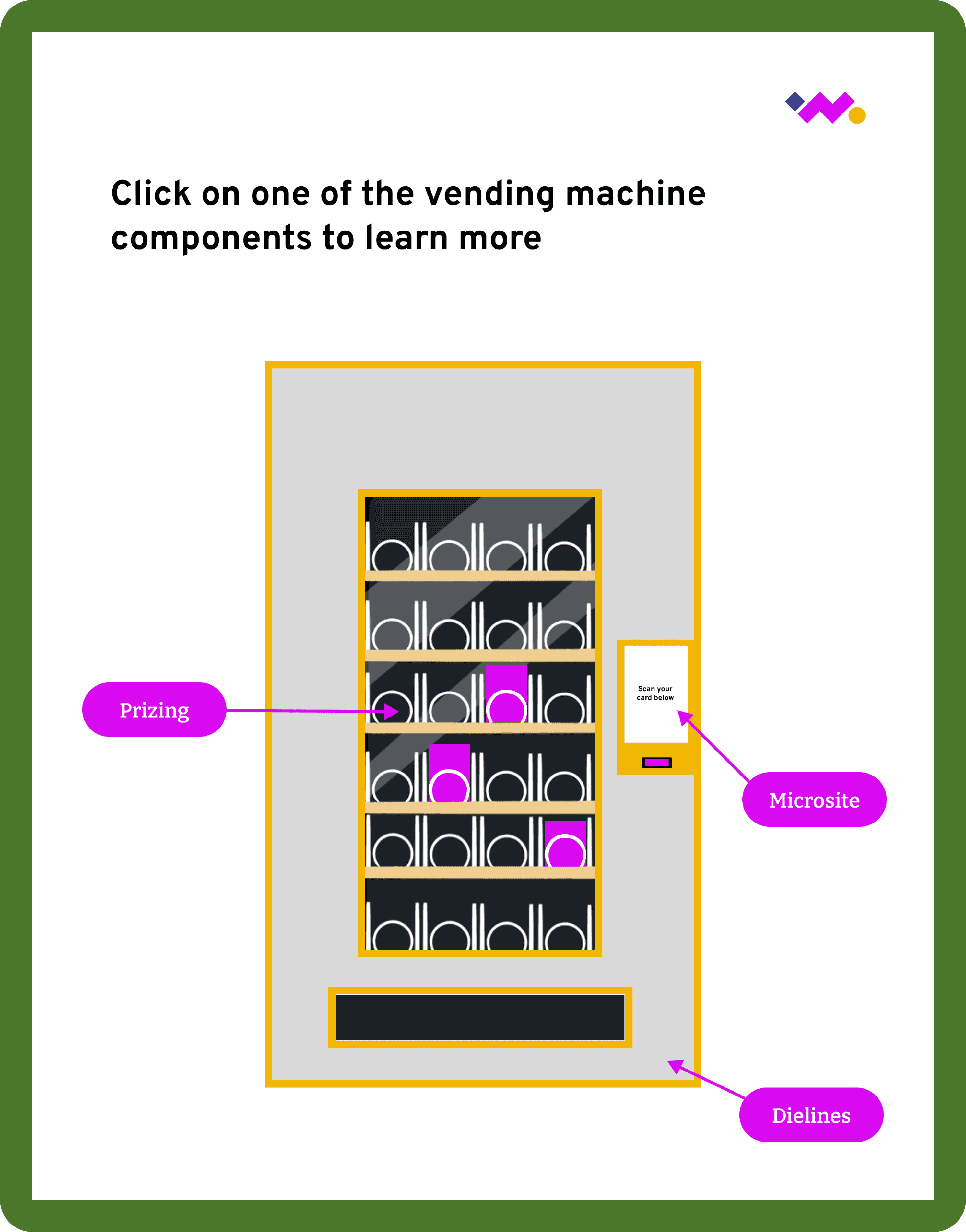 To improve context and flow, we redesigned demo pages to build off the home page vending machine visual. This explicitly points to the sections referenced on the homepage and helped users understand where they were in the experience.