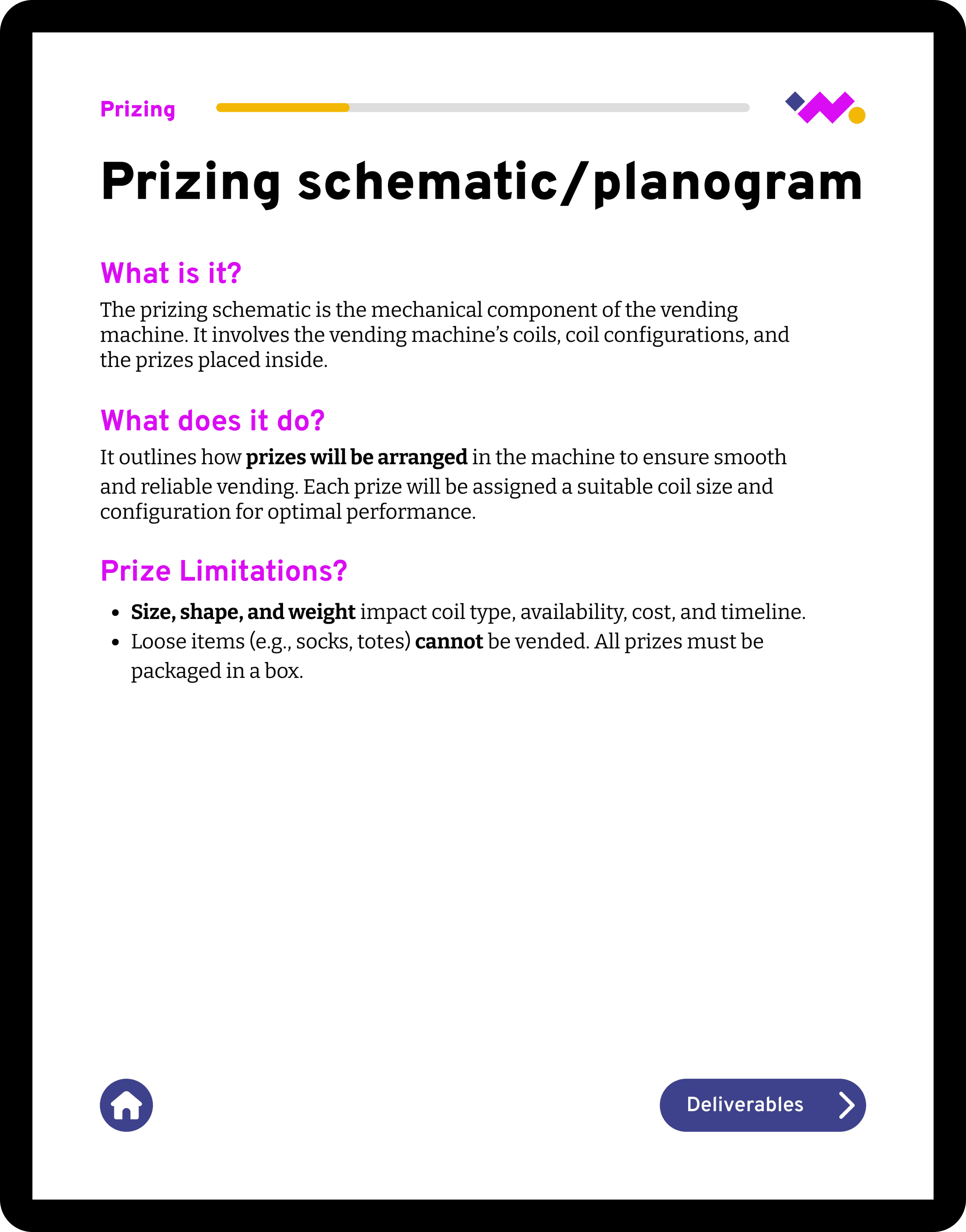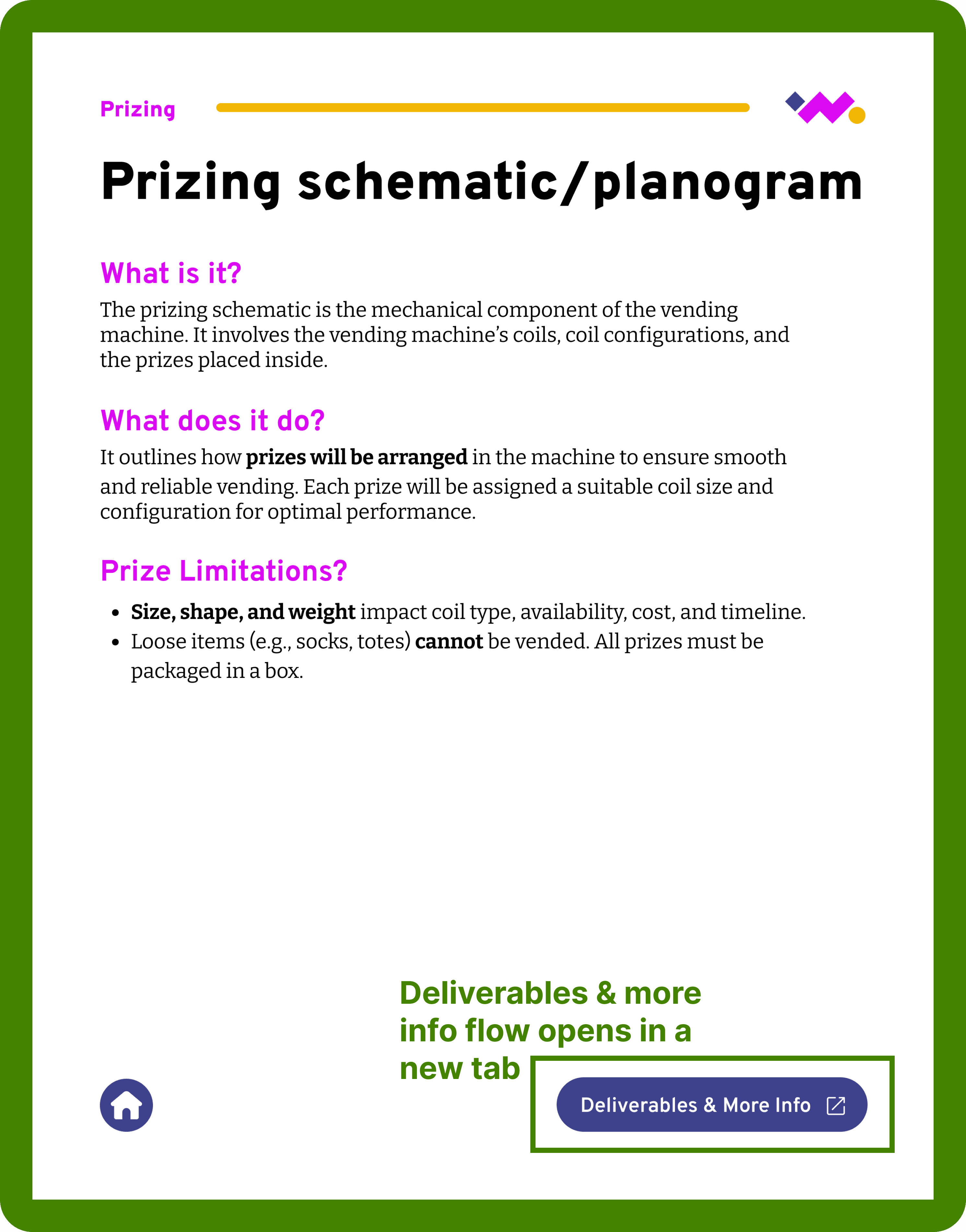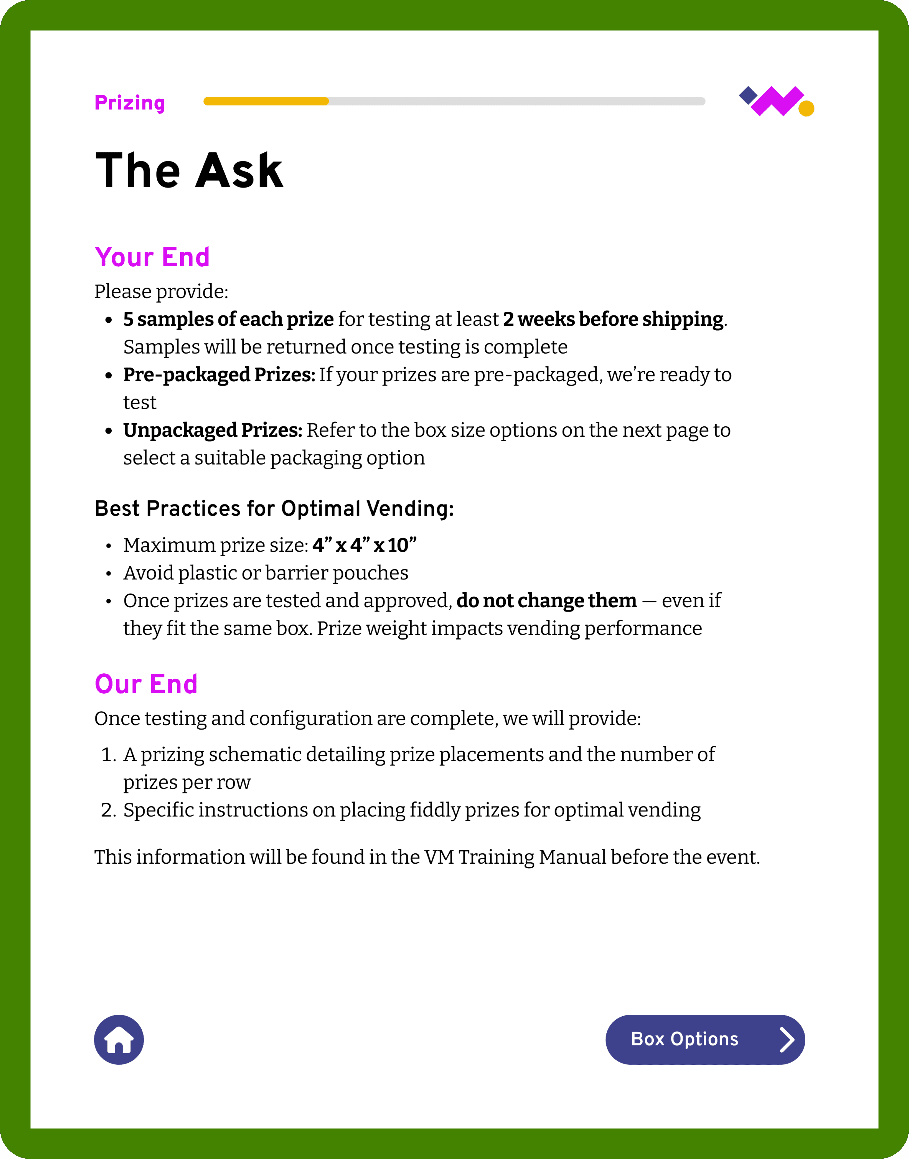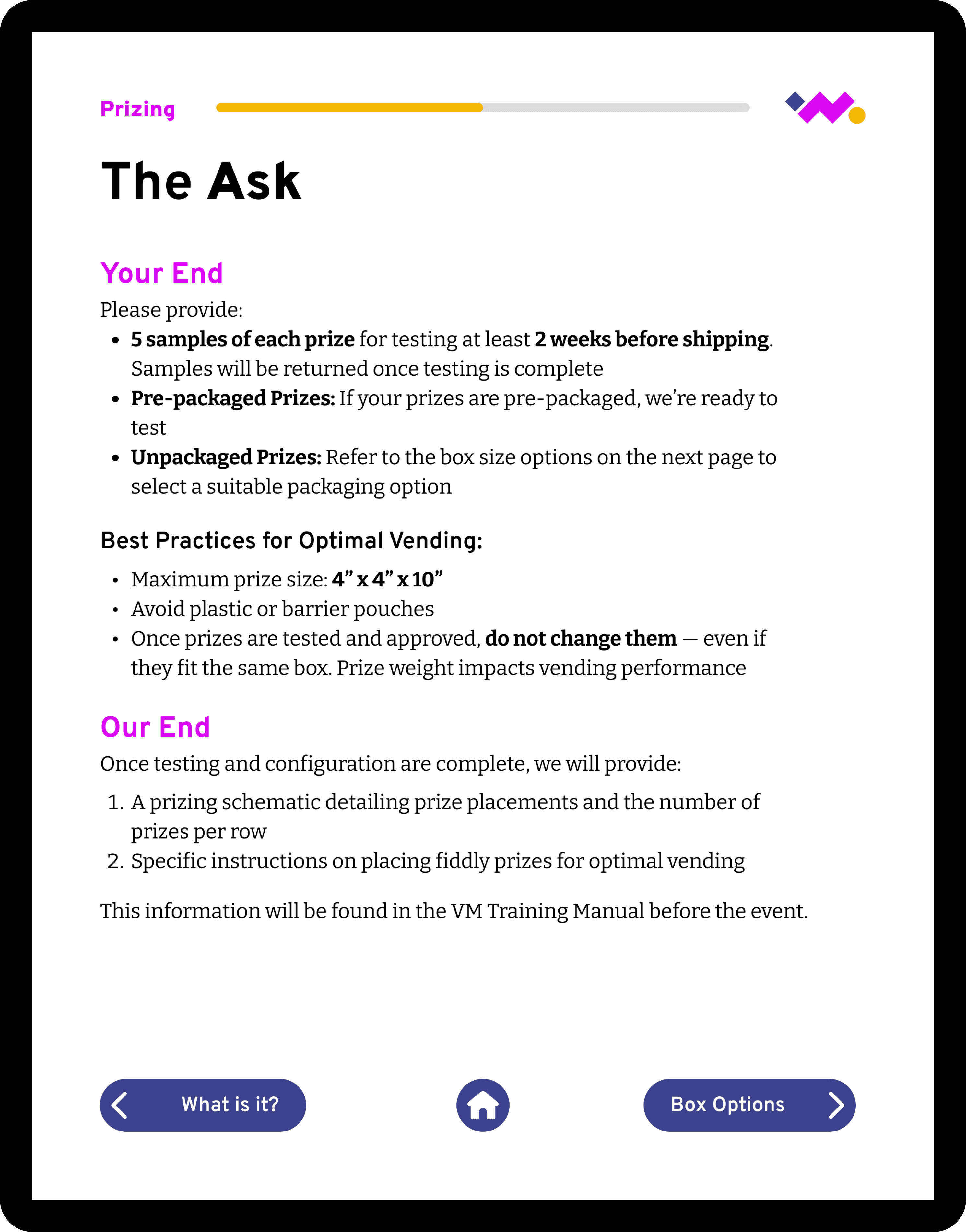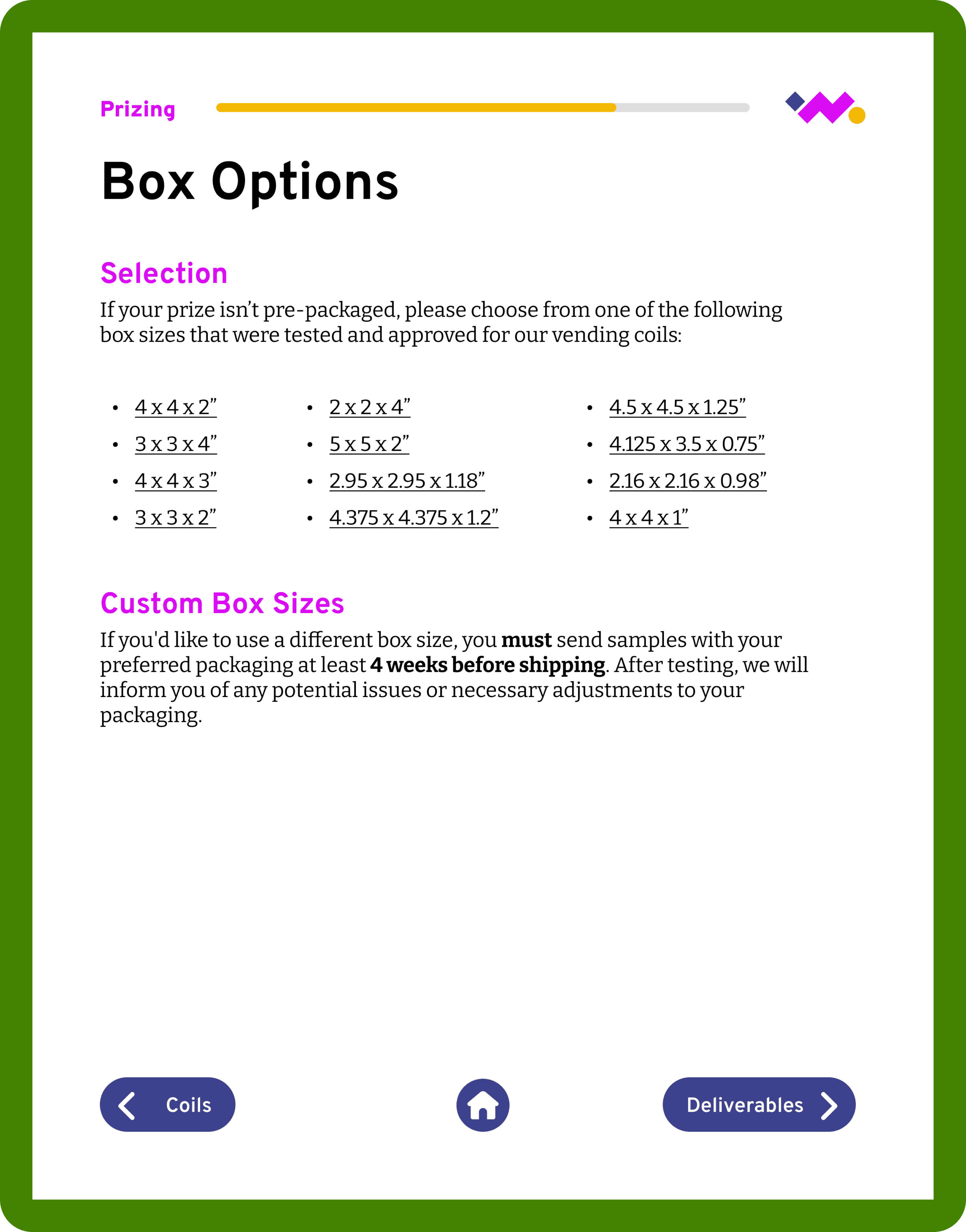 Initially, I focused on the microsite, dielines, and prizing matrix, which were the most confusing areas for clients. Moving forward, I'd like to scale this document to add sections on shipping & logistics and the copy deck to create a complete reference for wonderMakr's xVend projects.