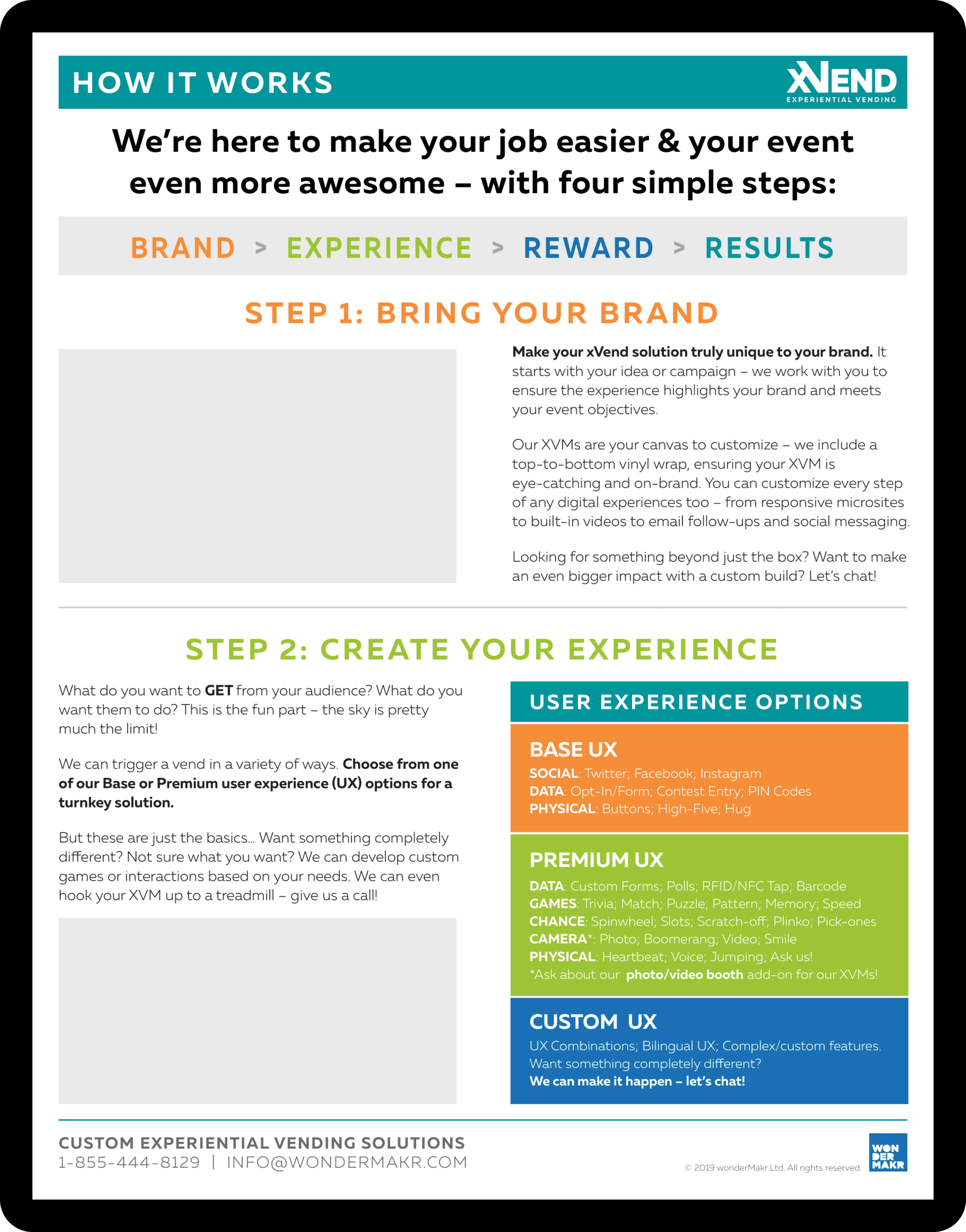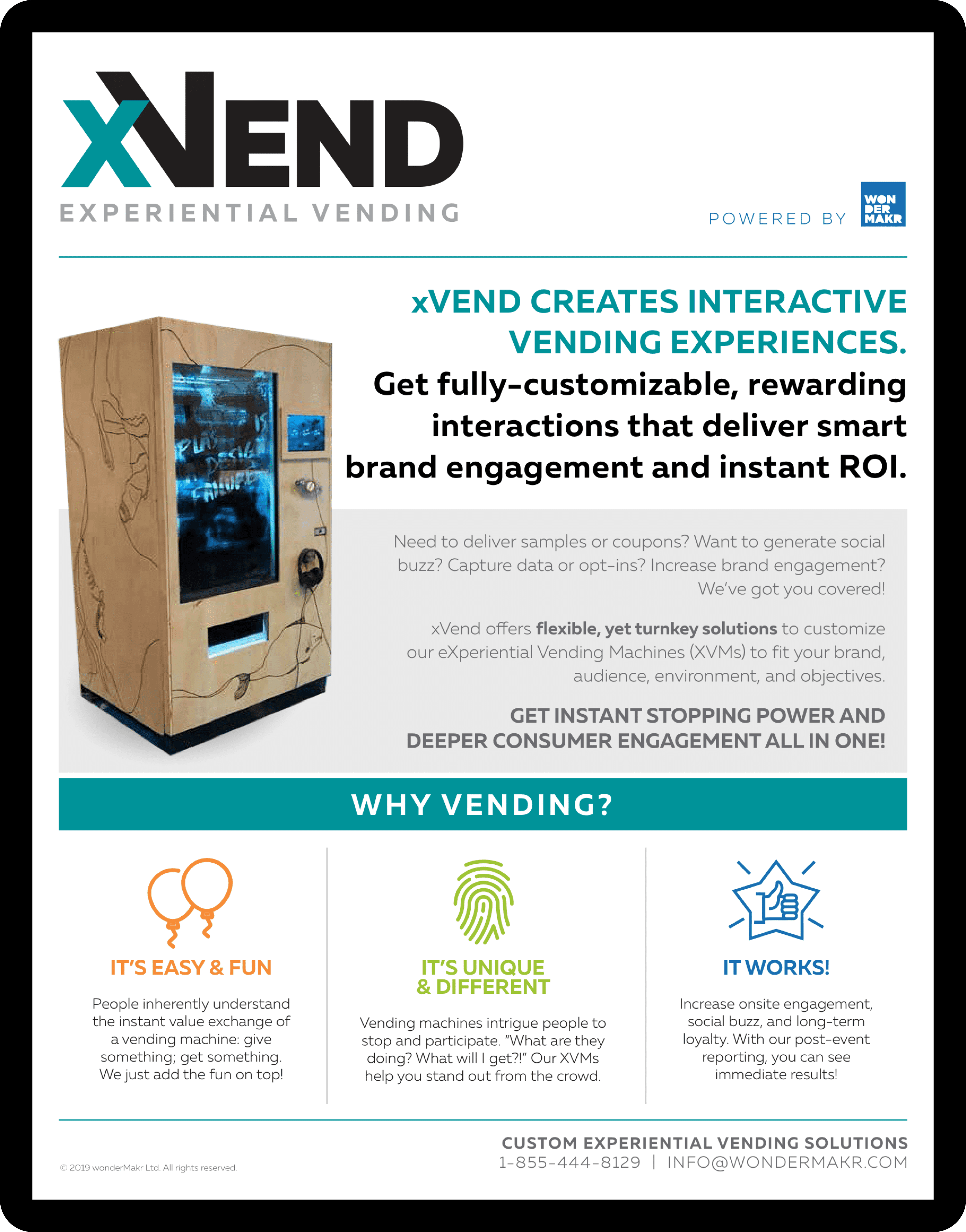 wonderMakr was the first company to create experiential vending machines in North America. These aren't standard vending machines, users interact through actions like scanning a badge or smiling at a camera to receive prizes. These xVend projects have become a core offering for the company.